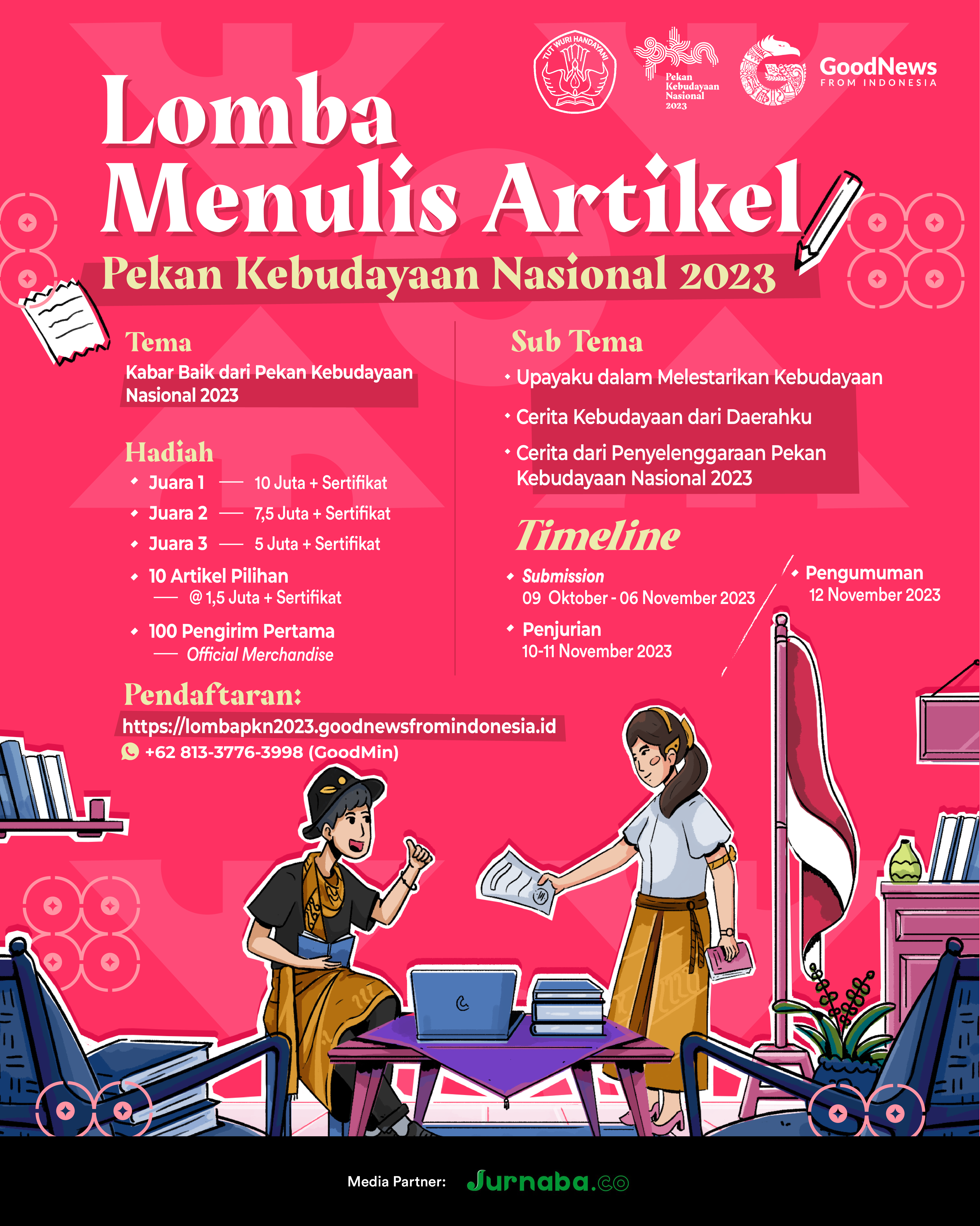 Nabs, yuk ikut lomba menulis tentang kabar baik dan kebudayaan dari daerahmu! Good News From Indonesia (GNFI) mengajak seluruh lapisan masyarakat untuk berpartisipasi mendukung misi kebudayaan dengan mengikuti lomba menulis artikel Pekan Kebudayaan Nasional 2023. Pekan Kebudayaan Nasional (PKN) merupakan penyelenggaraan event kebudayaan dimulaibpada 2018, melalui Kongres Kebudayaan Indonesia. Wadah ini diadakan oleh Kementerian Pendidikan, […]